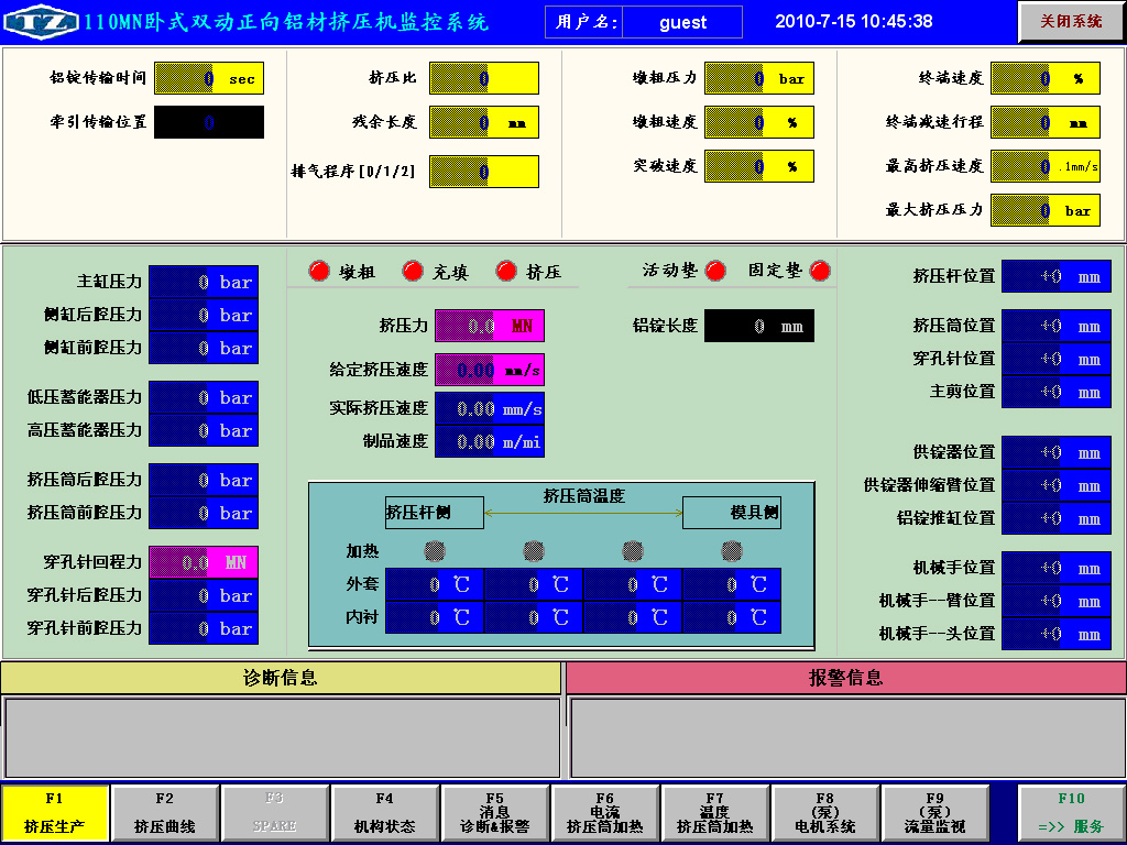 上位机与PLC通讯实现各机构位置、压力、油温、油位、液压回路仿真及挤压曲线的动态显示,工艺参数设定,电机启停及挤压筒加热控制。
